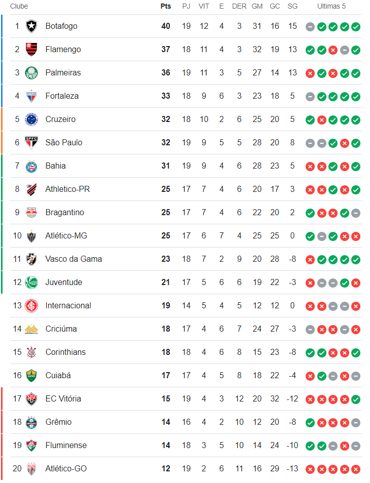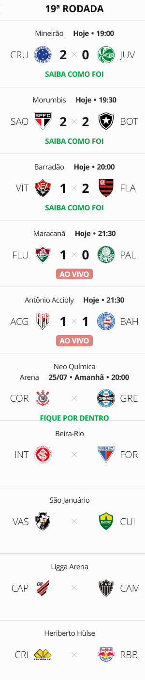 Cinco jogos abriram a 19ª rodada do Campeonato Brasileiro nesta 4ª-feira. O Vasco enfrentaria o Cuiabá, mas a partida foi adiada devido a um compromisso do clube mato-grossense pela Copa Sul-Americana. Como o Juventude foi derrotado pelo Cruzeiro, o Gigante da Colina segue na 11ª posição. O único jogo programado para 5ª-feira, Corinthians x Grêmio, não influirá na colocação do Vasco. Apesar de a 19ª rodada marcar o fim do 1º turno, nesta edição de 2024 há várias equipes com menos de 19 jogos realizados devido a adiamentos.