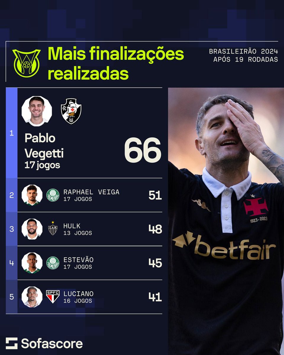 Jogadores com mais finalizações realizadas no 1º turno do @Brasileirao 2024. 👟👟