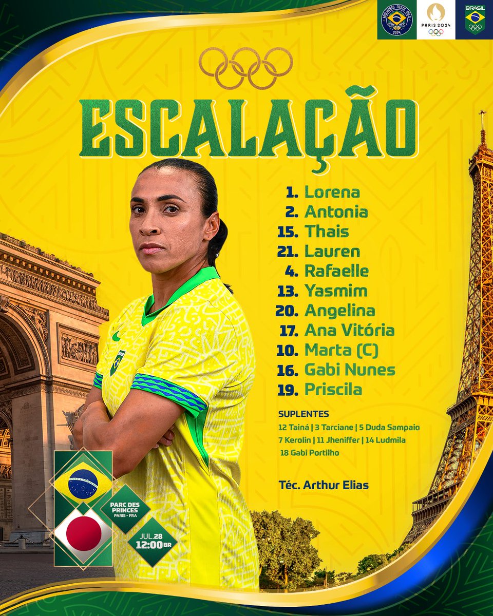 📋 A #SeleçãoFeminina está escalada para o segundo jogo nas Olimpíadas, contra o Japão, às 12h (horário de Brasília)! Você assiste ao vivo na @tvglobo, @sportv e @CazeTVOficial! VAAAI, BRASIL! 🇧🇷
