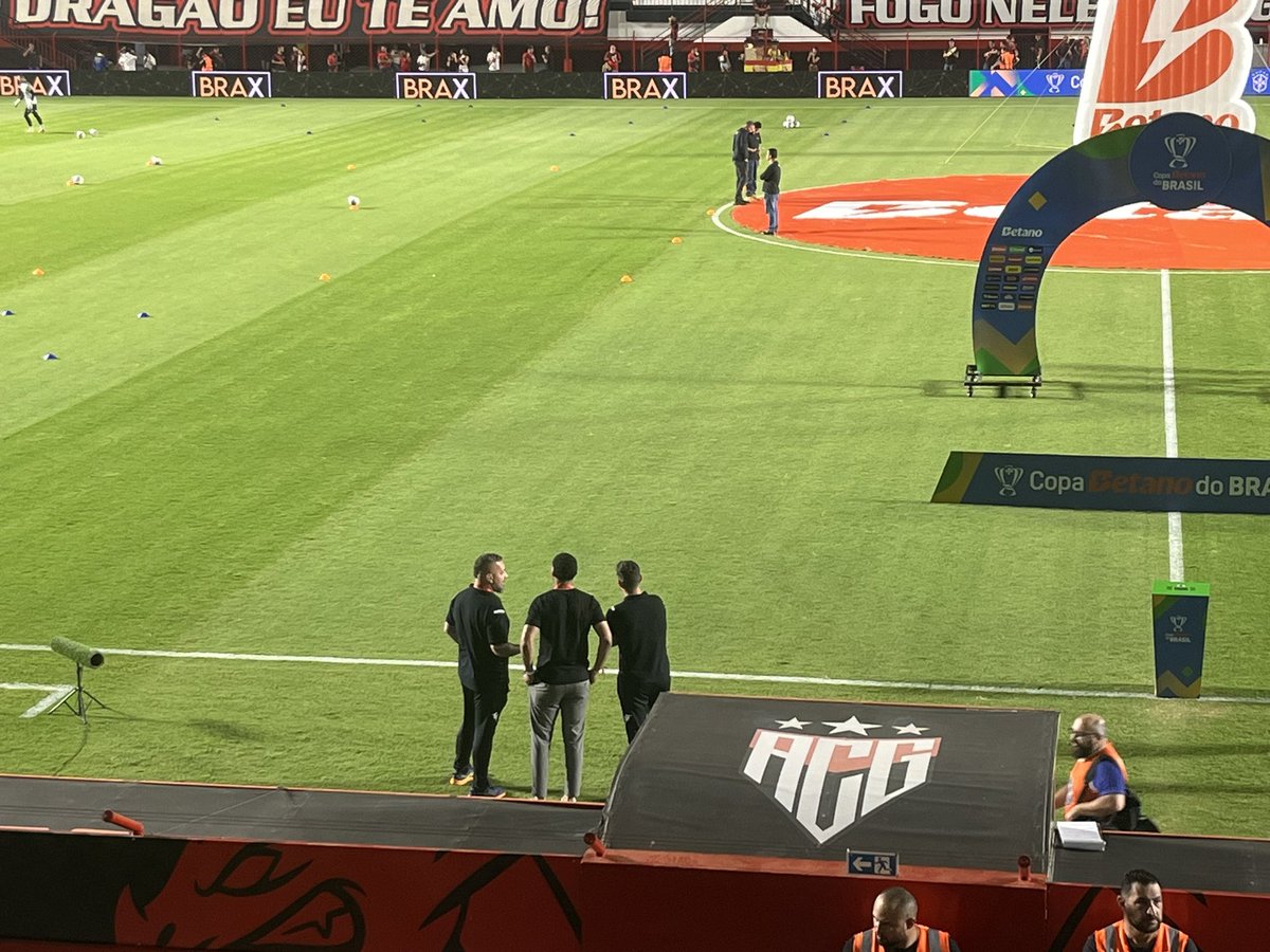 Halls chegou ao estádio com a delegação do Vasco. Ele está agora na beira do campo. O goleiro vascaíno está emprestado ao Vila Nova, rival do Atlético-GO.