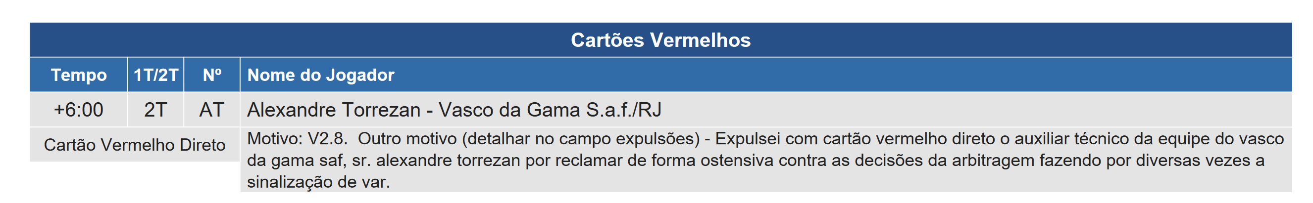 Auxiliar-técnico vascaíno Alexandre Torrezan foi expulso no fim do jogo; veja justificativa do árbitro para o cartão vermelho
