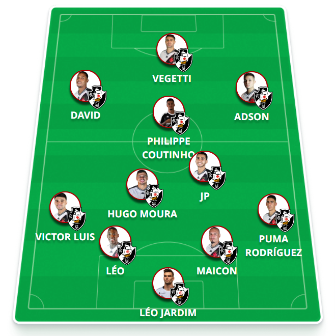 Provável escalação do Vasco: Léo Jardim, Puma Rodríguez, Maicon (Rojas), Léo e Victor Luís; Hugo Moura, JP (Sforza/Souza) e Philippe Coutinho; Adson, David (Payet) e Vegetti.