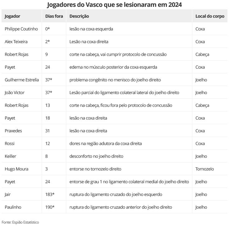 Veja a lista de jogadores do Vasco que se lesionaram em 2024. Abaixo, com asterisco na data, os jogadores que seguem indisponíveis. O levantamento é do Espião Estatístico.