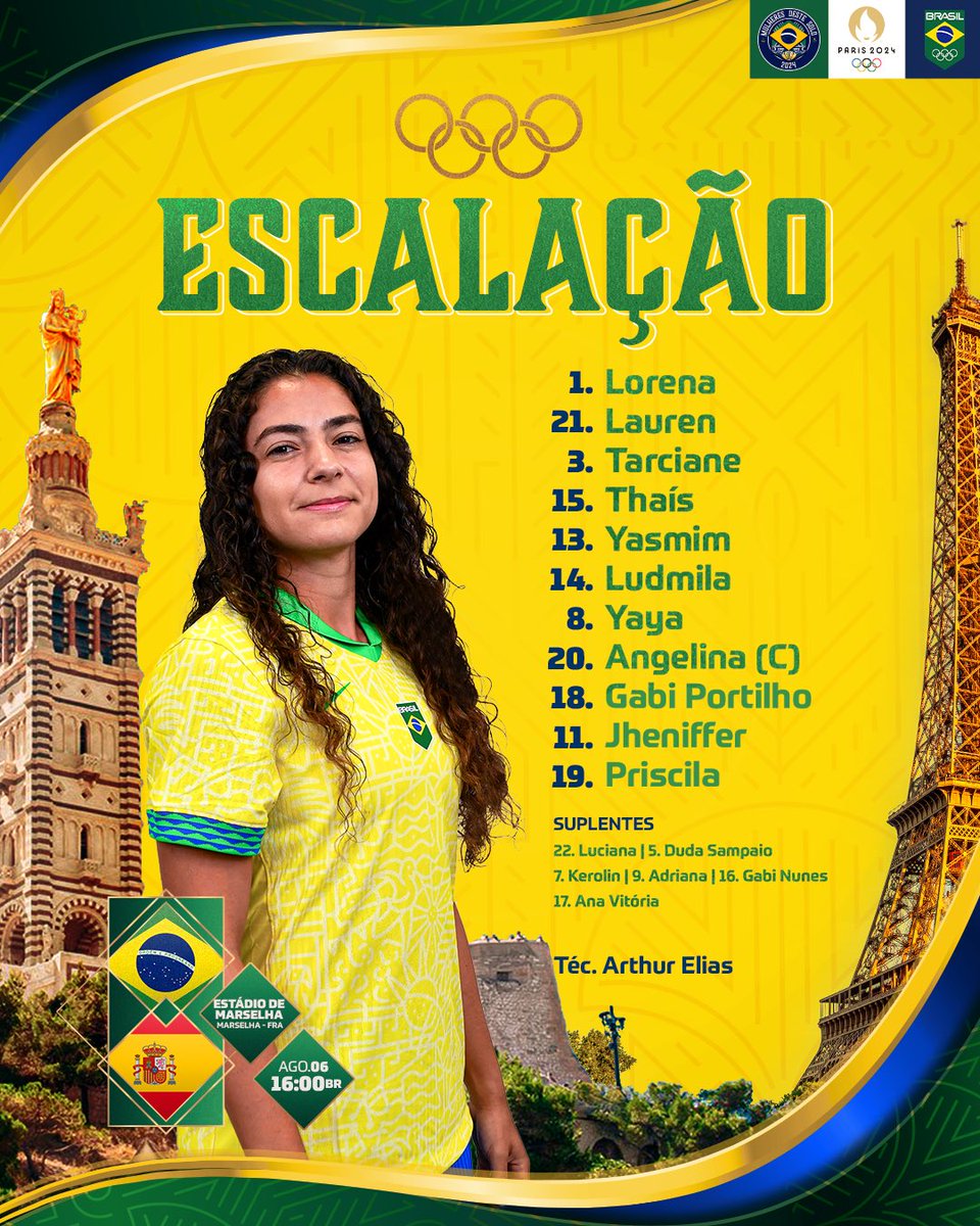 📋 A #SeleçãoFeminina está escalada para a semifinal das Olimpíadas, contra a Espanha, às 16h (horário de Brasília)! Você assiste ao vivo na @tvglobo, @sportv e @CazeTVOficial! VAAAI, BRASIL! 🇧🇷