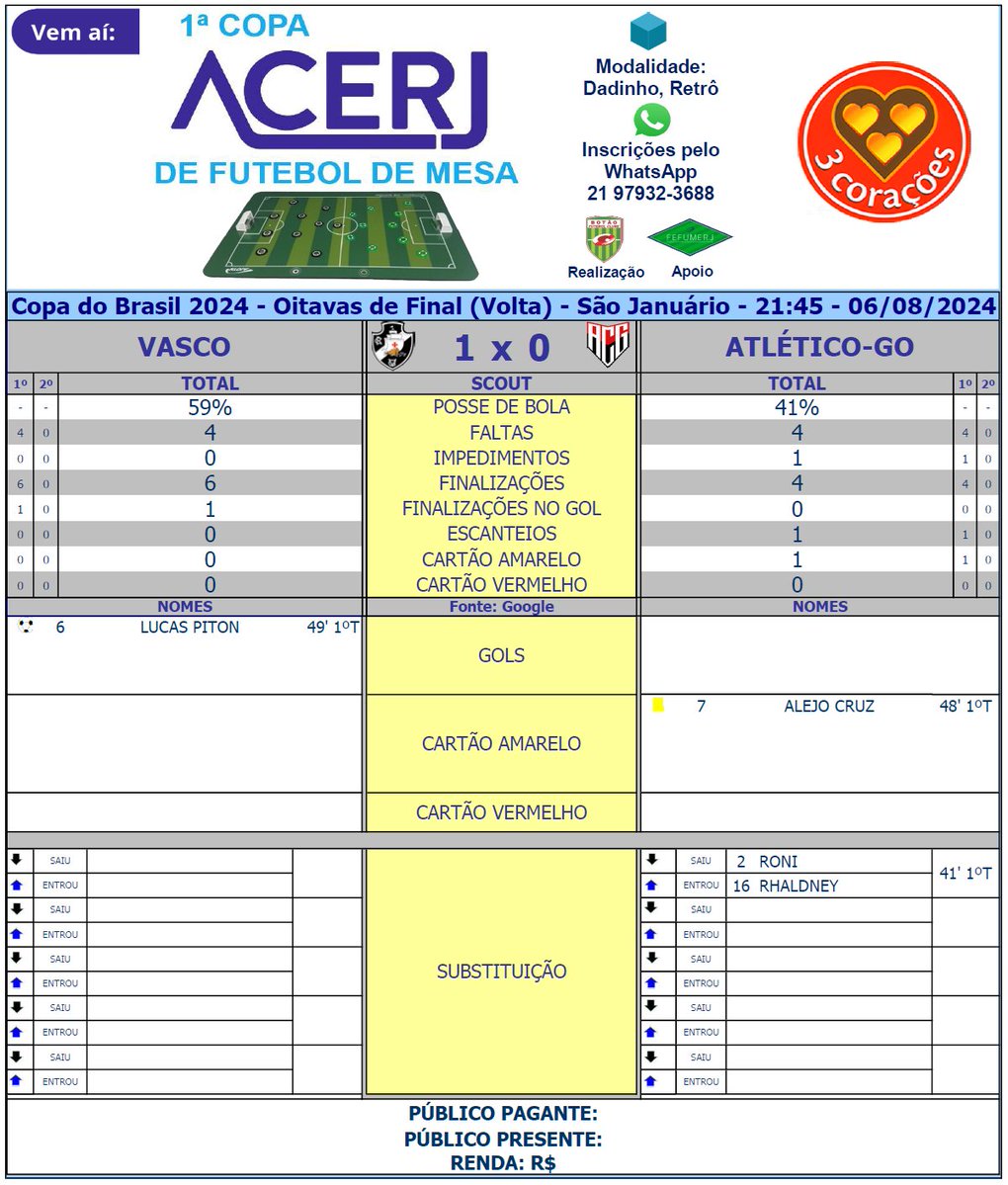 Scout do 1º Tempo de Vasco e Atlético-GO pelo jogo de volta das oitavas de final da Copa do Brasil 2024 em São Januário (Fonte: Google) #Acerjinforma #CopaDoBrasil #VASxACG #Vasco #AtleticoGO @CopaDoBrasilCBF @VascodaGama @ACGOficial