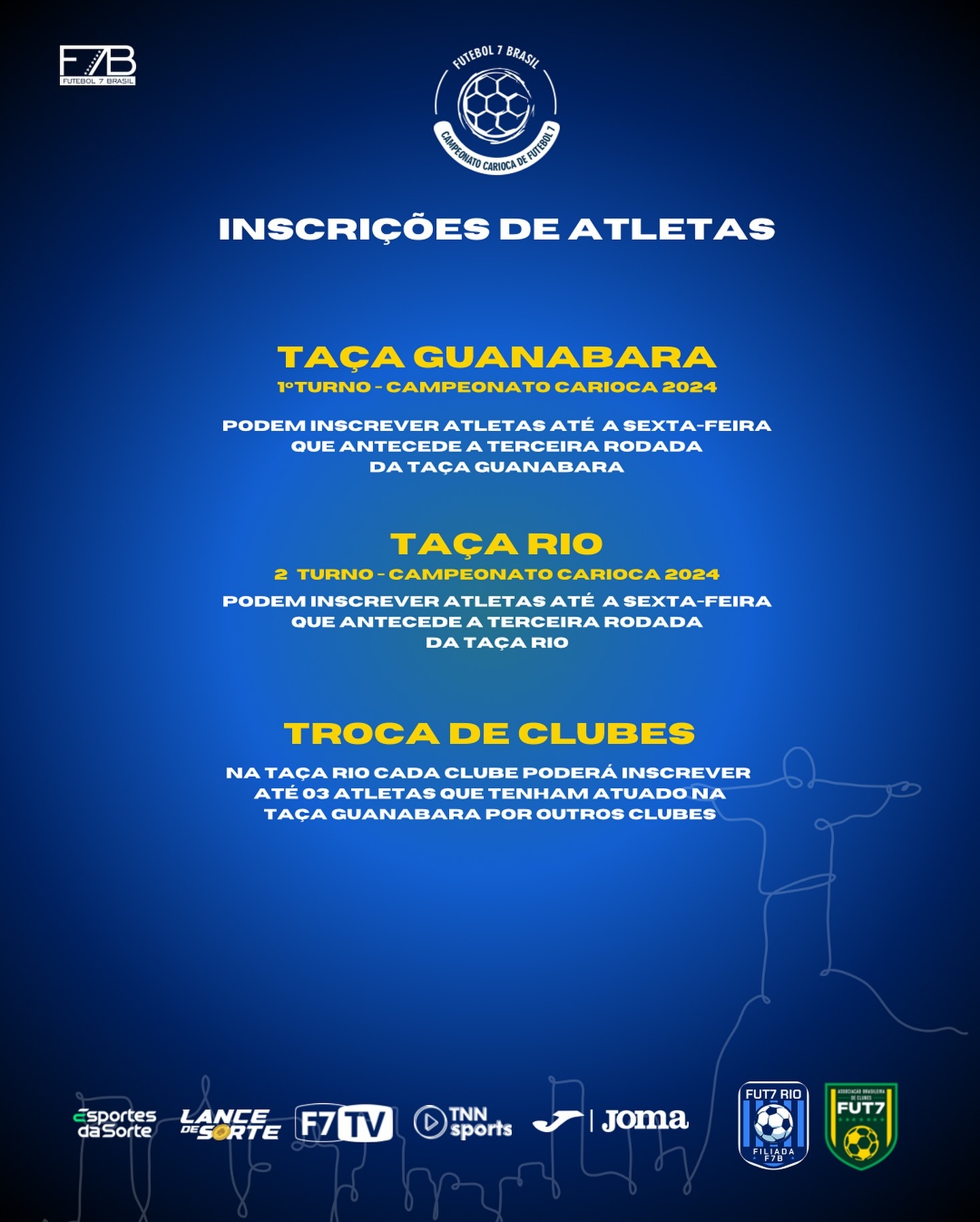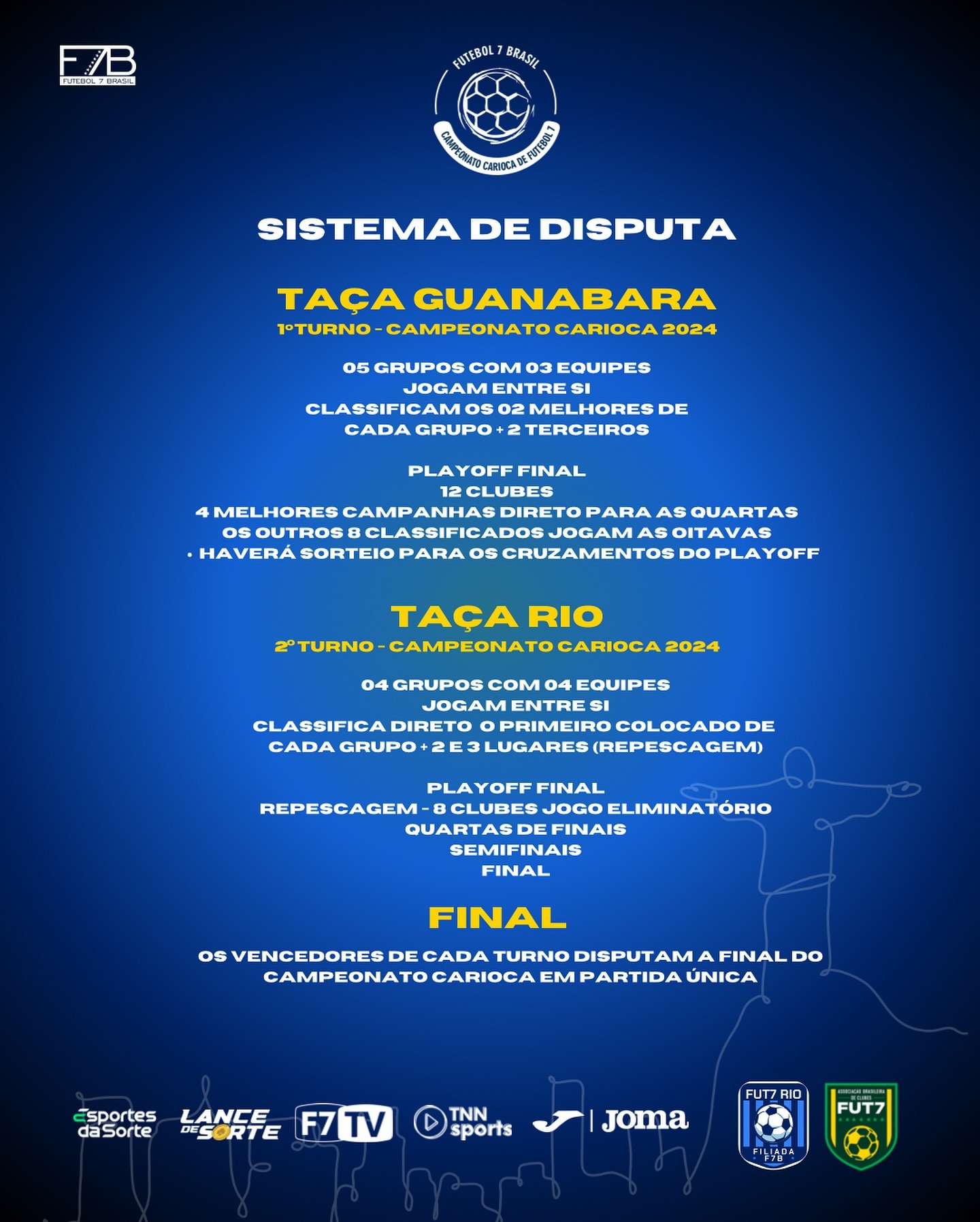 Neste sábado começa o Campeonato Carioca de Futebol 7. No primeiro turno os times disputam o título da Taça Guanabara e no segundo turno lutam pelo título da Taça Rio. Os vencedores de cada turno disputam a final. Em caso de uma equipe vencer os dois turnos, ela será a campeã.