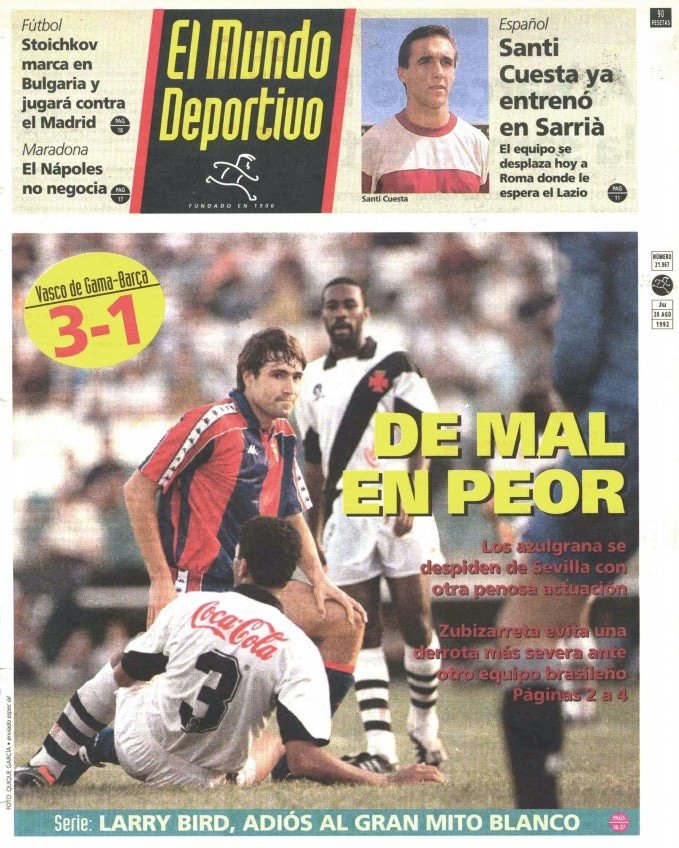 19/08/1992 - Exatos 32 anos pelo Troféu Cidade de Sevillha, o Vasco da Gama de Joel Santana vencia por 3x1 o Barcelona que era comandado pelo técnico Cruijff. Gols: Júnior (35 1°T), Winck (43 2°T) e Edmundo (45 2°T) para o cruzmaltino, e Beguiristain (40 2°T) para o time catalão.