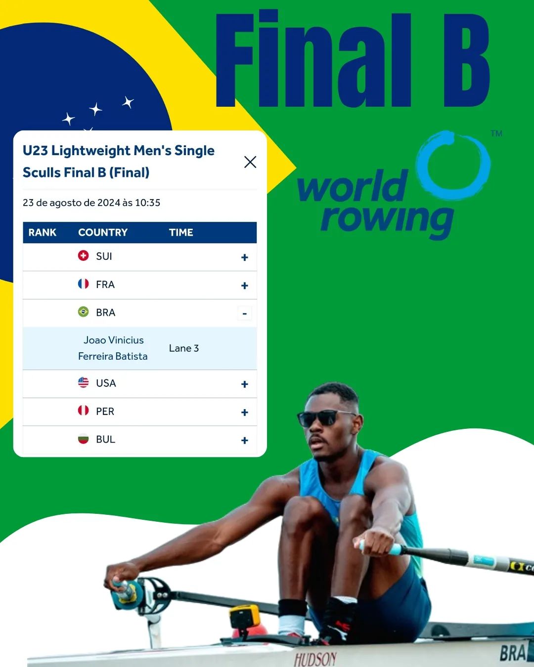 Sua prova será transmitida Ao Vivo às 10:35 horário de Brasília no canal da World Rowing no YouTube, irei disponibilizar o link nos storys.
