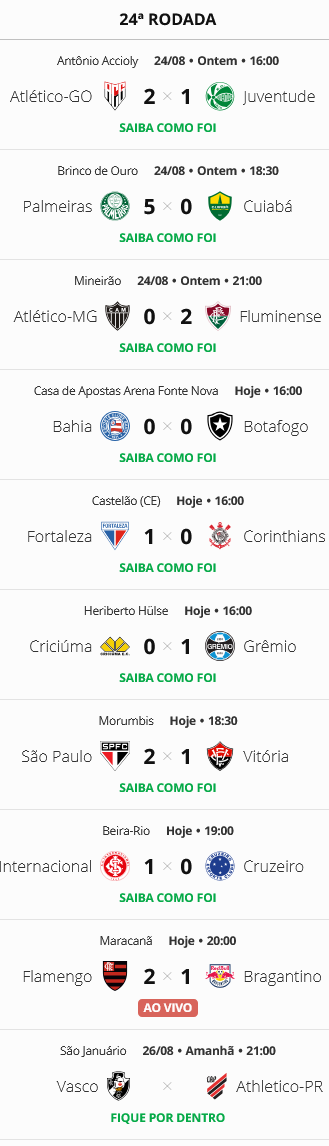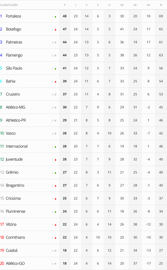 Terminados os jogos de domingo da 24ª rodada do Campeonato Brasileiro, o Vasco, que enfrenta o Athletico-PR nesta segunda-feira em São Januário, segue na 10ª colocação.