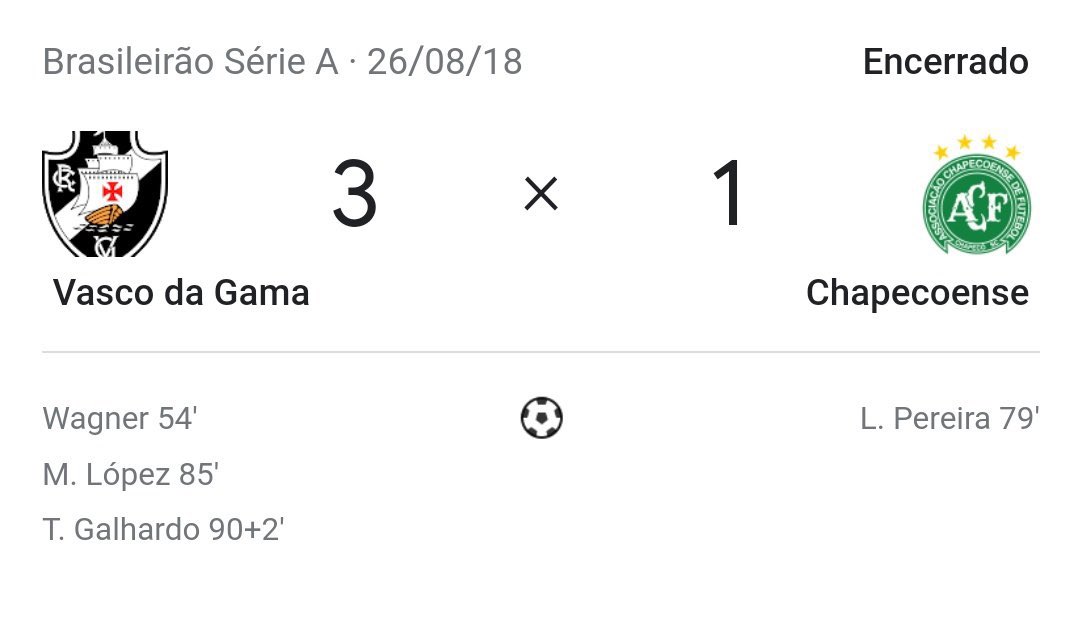 26/08/2018 - Vasco 3 x 1 Chape em São Januário com o jogo resolvido nos minutos finais.