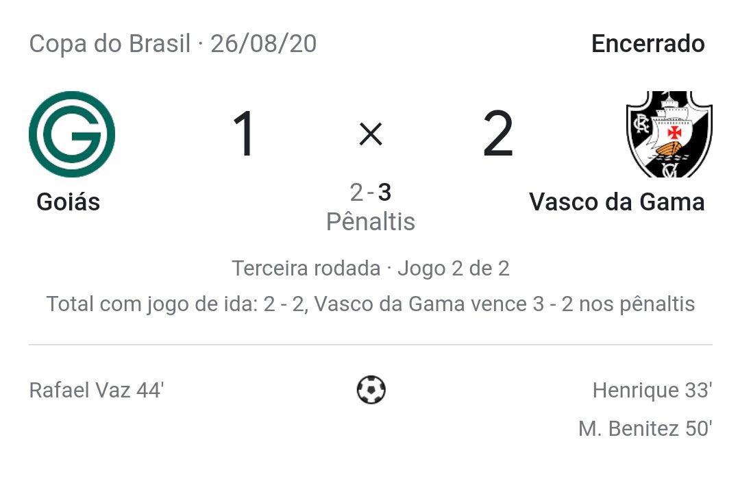 26/08/2020 - Goiás 1 x 2 Vasco, pela Copa do Brasil, no jogo em que o lateral Henrique marcou o seu único gol com a camisa do Vasco no profissional.