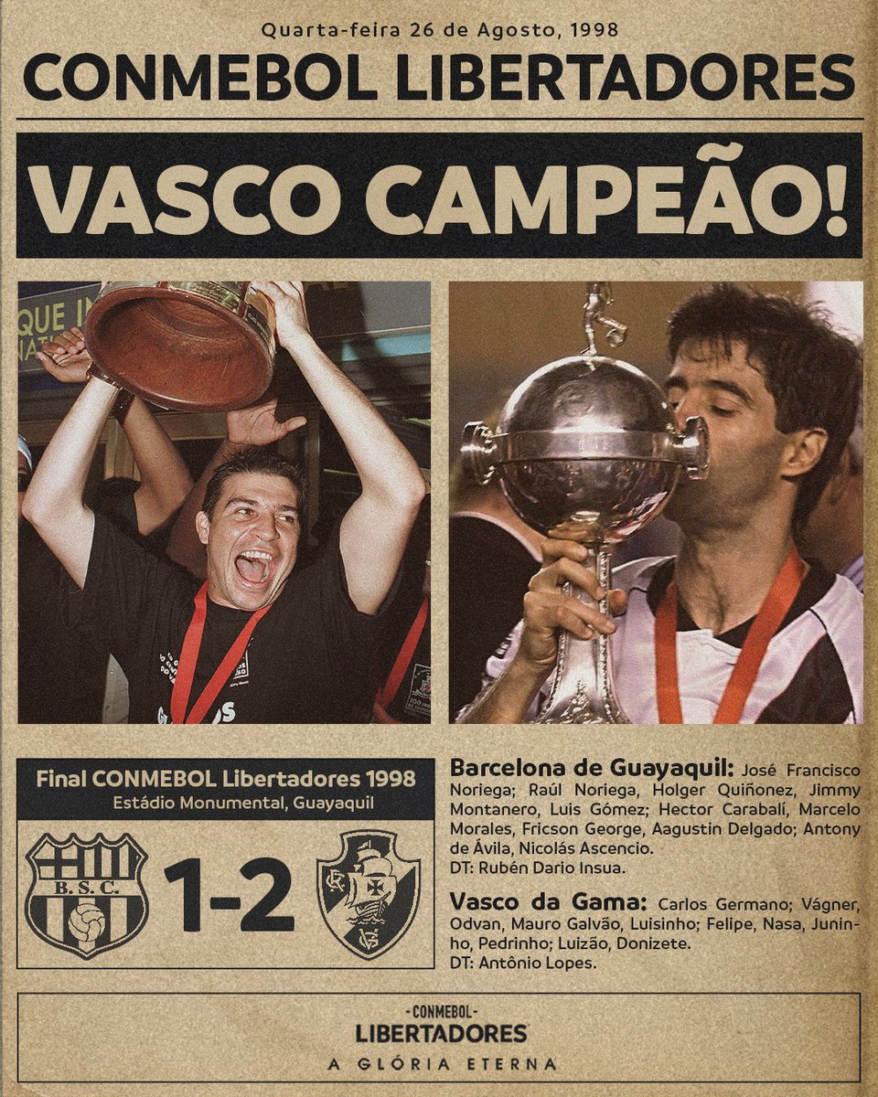 💢🏆 A #GloriaEterna do @VascodaGama! Há 2⃣6⃣ anos, o clube conquistou o título da CONMEBOL #Libertadores 1998, no Equador.