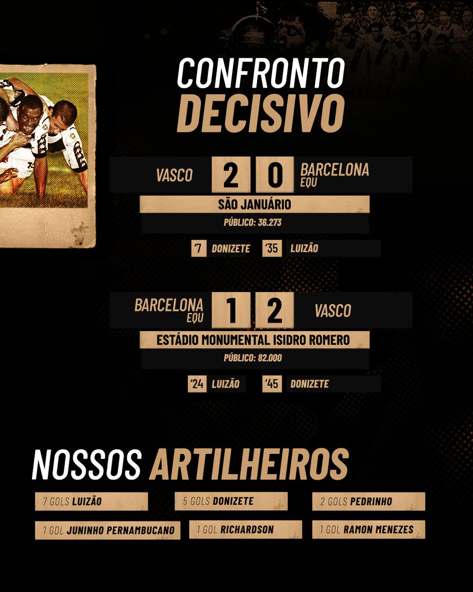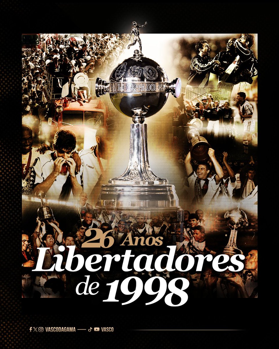 No ano do centenário, há exatos 26 anos, no dia 26 de agosto de 1998, o 𝐕𝐀𝐒𝐂𝐎 vencia o Barcelona-EQU por 2 a 1, em Guayaquil, e conquistava a Libertadores da América! 🏆💢
