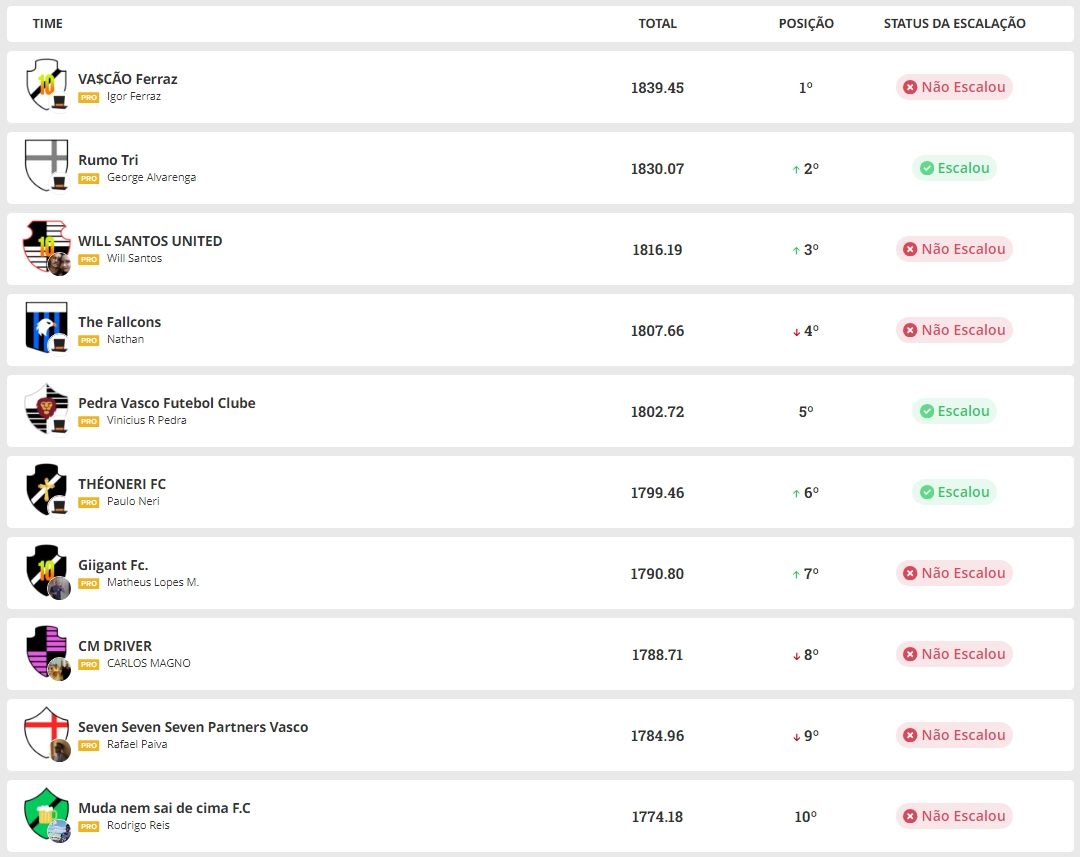 15/07/24 - Cartola: Confira a classificação da Liga NETVASCO após a 16ª rodada