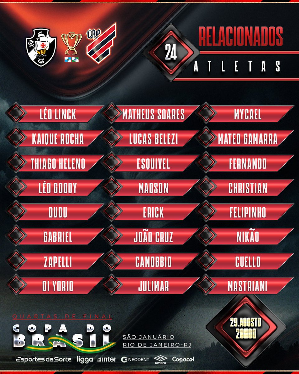 Veja os relacionados do Athletico-PR para o jogo contra o Vasco pela Copa do Brasil
