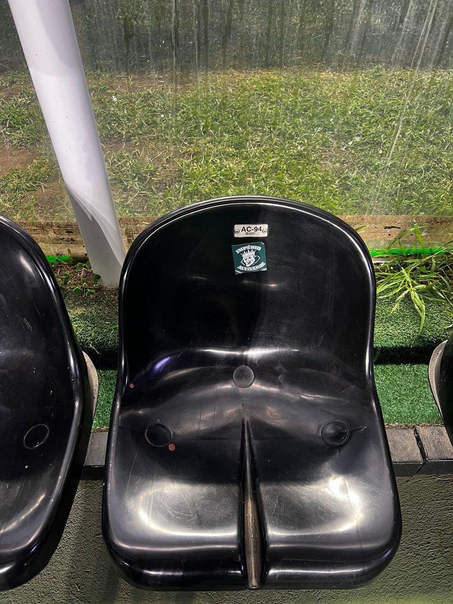 Os bancos onde estão os jogadores reservas do Athletico, estavam com um adesivo do Coritiba colado.