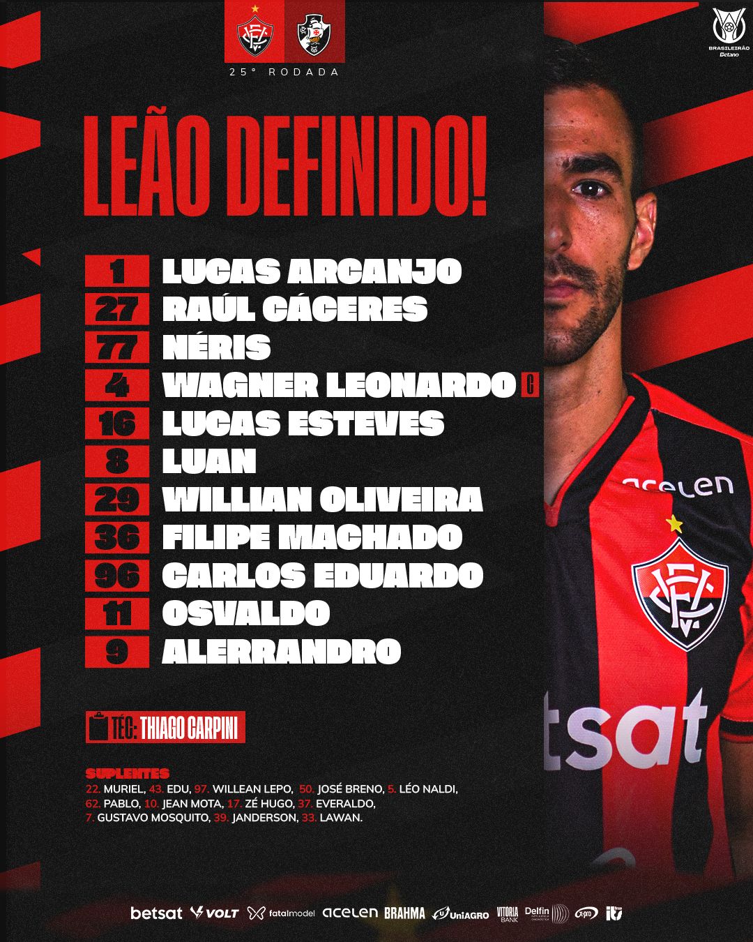 Veja a escalação do Vitória para o jogo contra o Vasco; ex-vascaíno Raúl Cáceres é titular