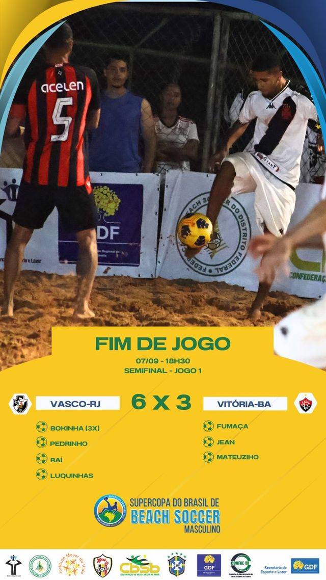 O Vasco derrotou o Vitória por 6 a 3 na noite deste sábado e se classificou para a final da Supercopa do Brasil de Beach Soccer.