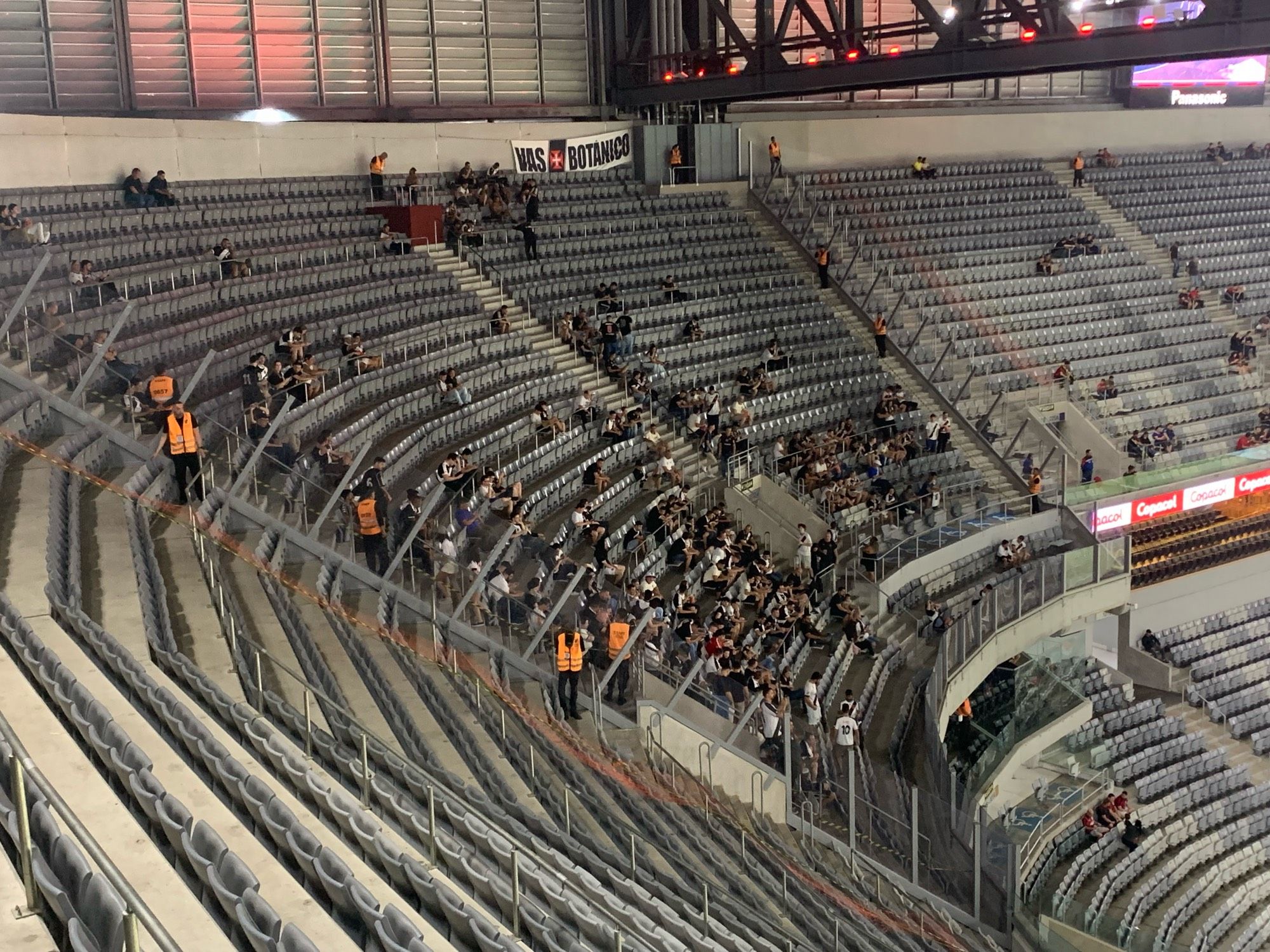 Torcida do Vasco vai ficar posicionada nessa área à esquerda das cabines. Alguns torcedores já estão por aqui faltando pouco mais de 1h pro jogo