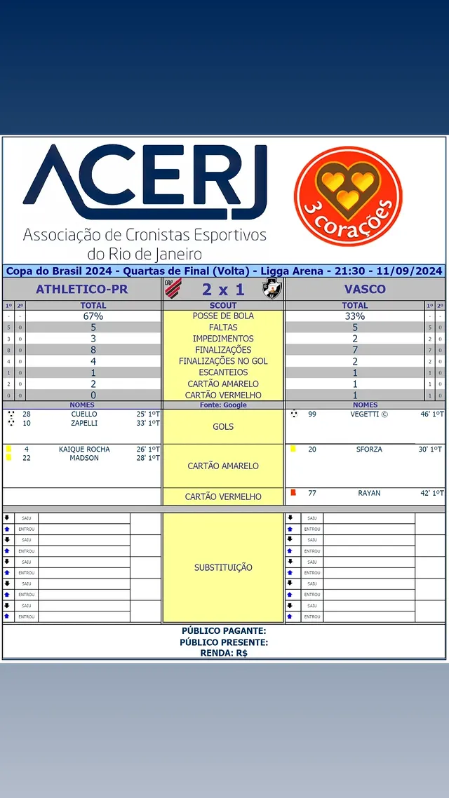 11/09/24 - Palpite NETVASCO: O resultado mais palpitado foi Athletico-PR 1 x 1 Vasco