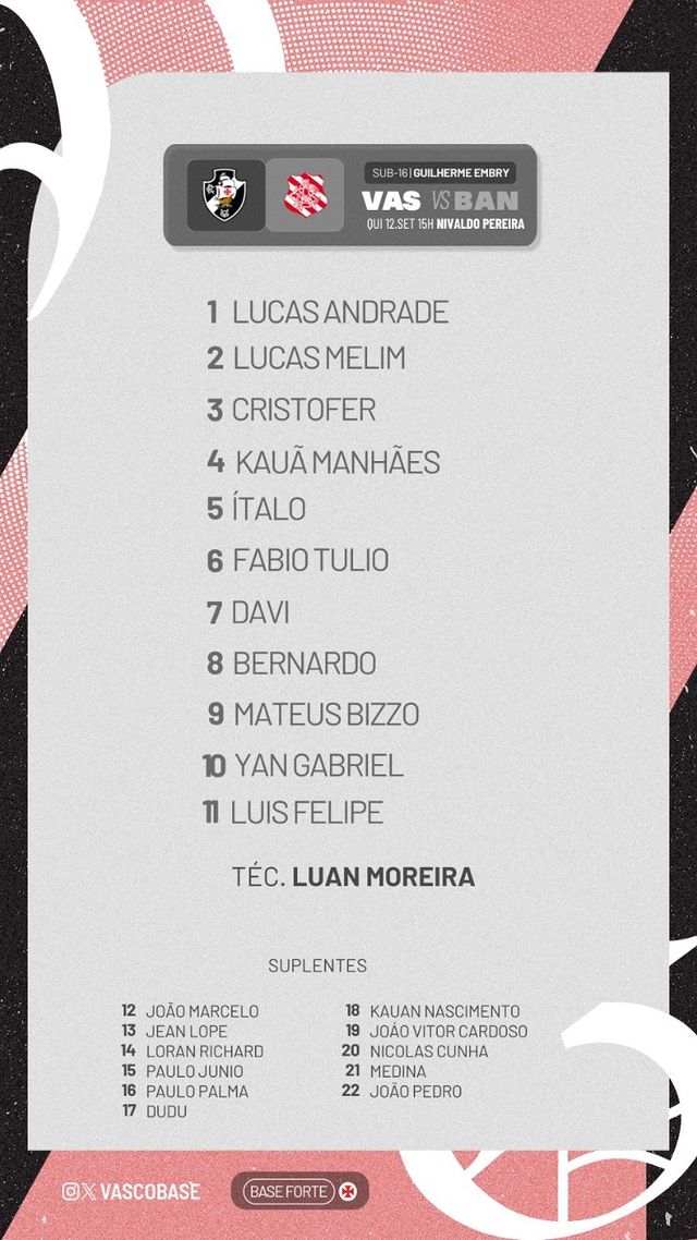 12/09/24 - Sub-16: Veja o press kit de Vasco x Bangu, pelo Guilherme Embry