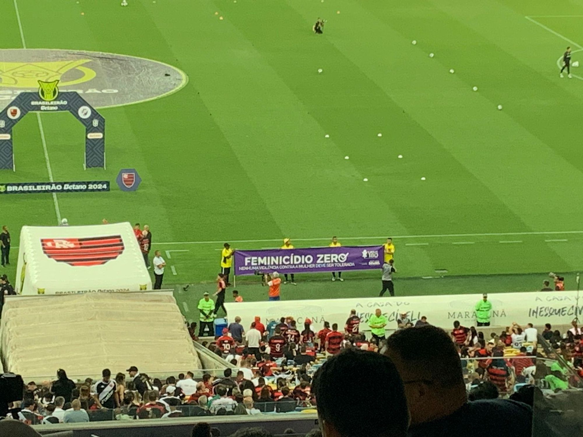 Faixa 'Feminicídio Zero' é estendida no gramado do Maracanã antes de Urubu x Vasco