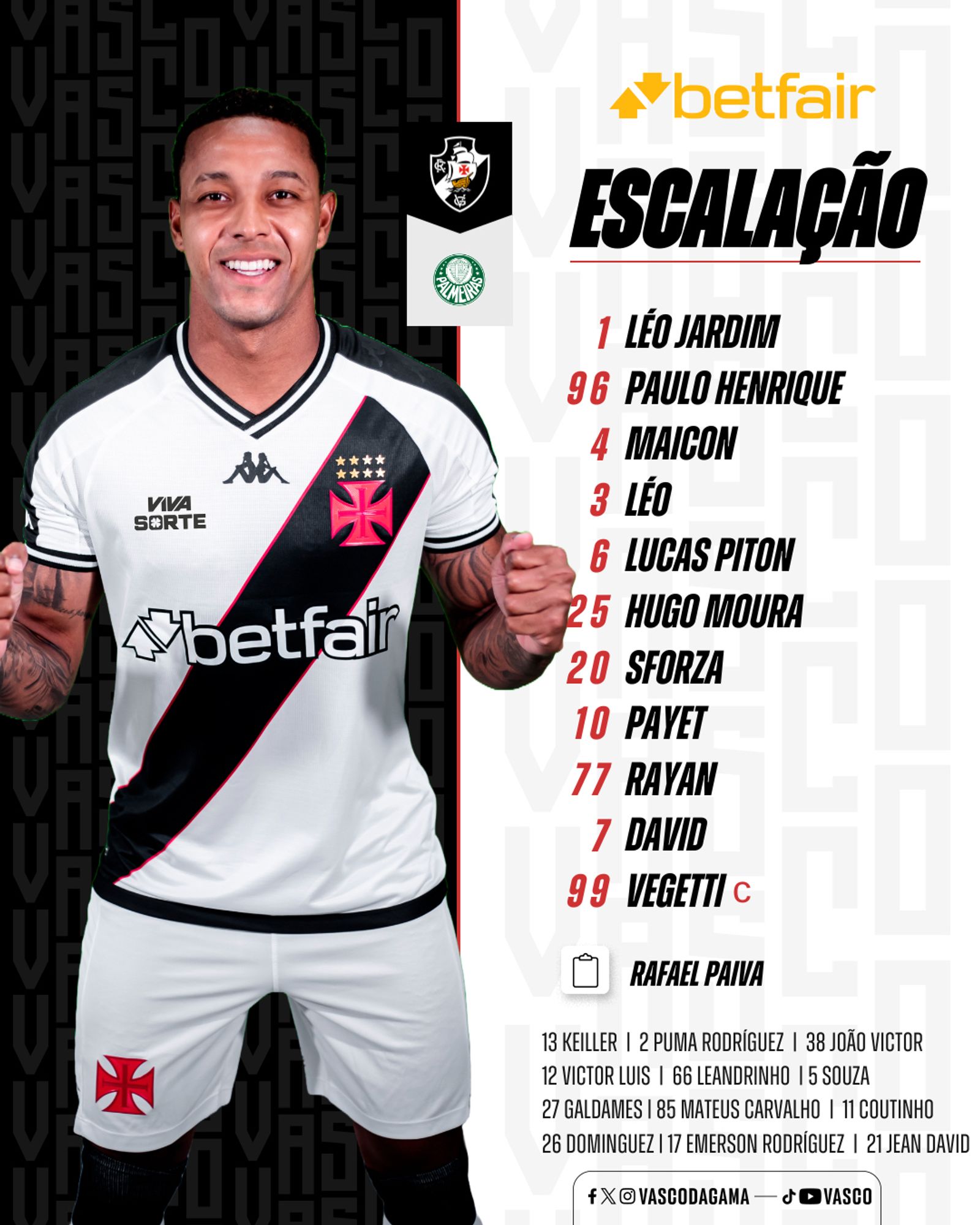 Confira a escalação do Vasco para o jogo contra o Palmeiras; Rayan volta ao time titular e João Victor é opção no banco