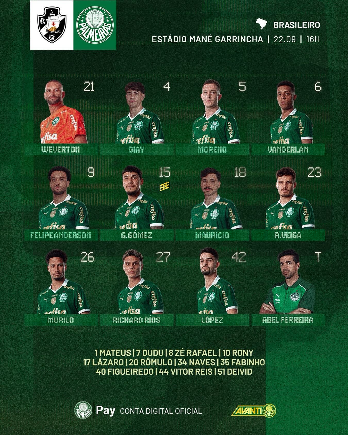 22/09/24 - Confira a escalação do Vasco no 1º turno do Brasileiro 2024 contra o Palmeiras