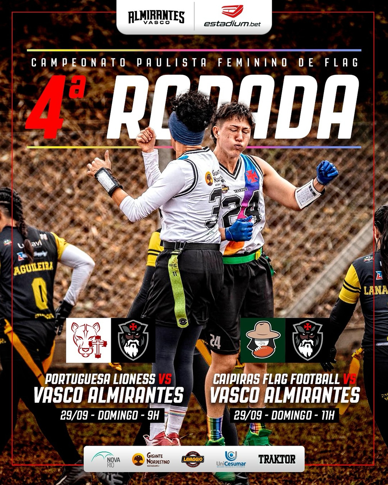Nossas atletas de Flag viajam pra Piracicaba para a última rodada da temporada regular do Paulista de Flag. Enfrentam a Portuguesa e em sequência o Caipiras. O Vasco é o único time invicto no campeonato e já está classificado pra semifinal de Conferência no dia 24/11 com local a definir!
