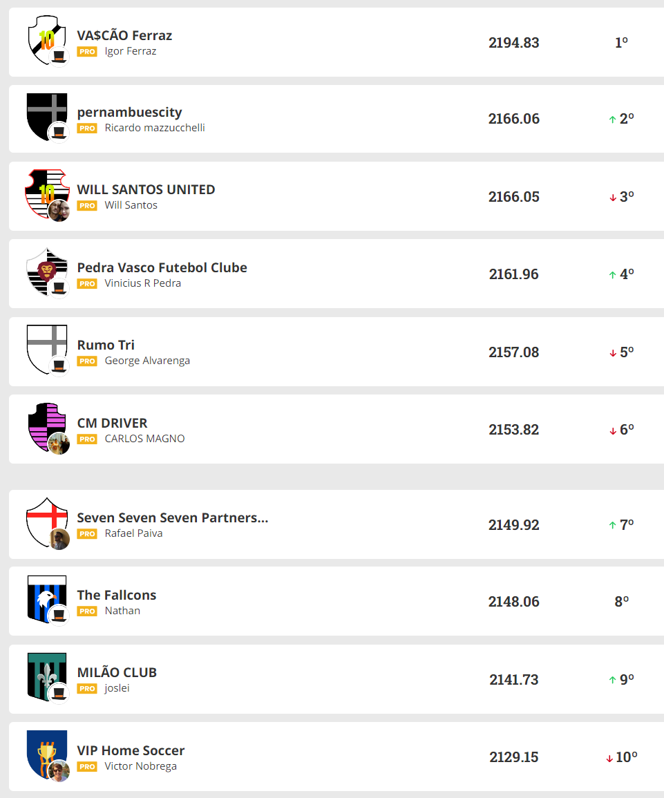 17/09/24 - Cartola: Confira a classificação da Liga NETVASCO após a 26ª rodada