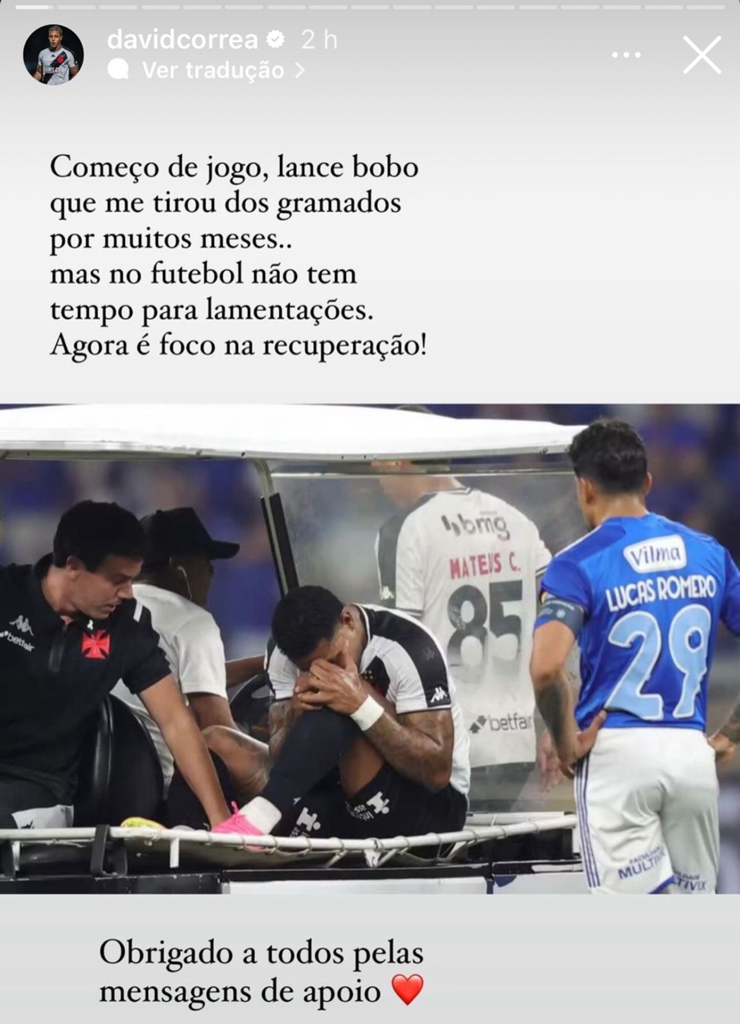 David lamenta lesão e agradece mensagens de apoio