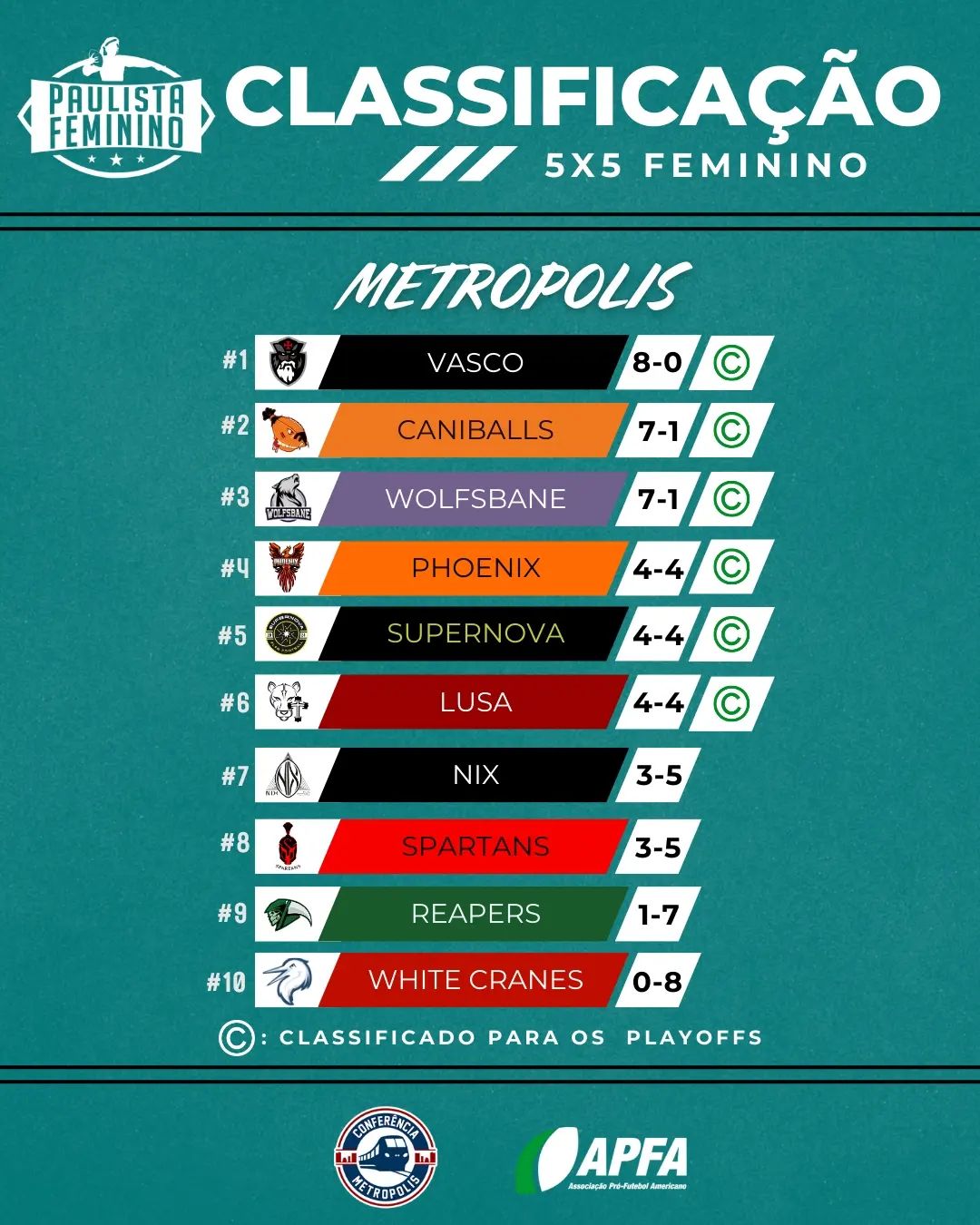 Depois da nossa oitava rodada, confira a classificação do Paulista de Flag Feminino - Conferências. Confira também os times já classificados para os Playoffs.