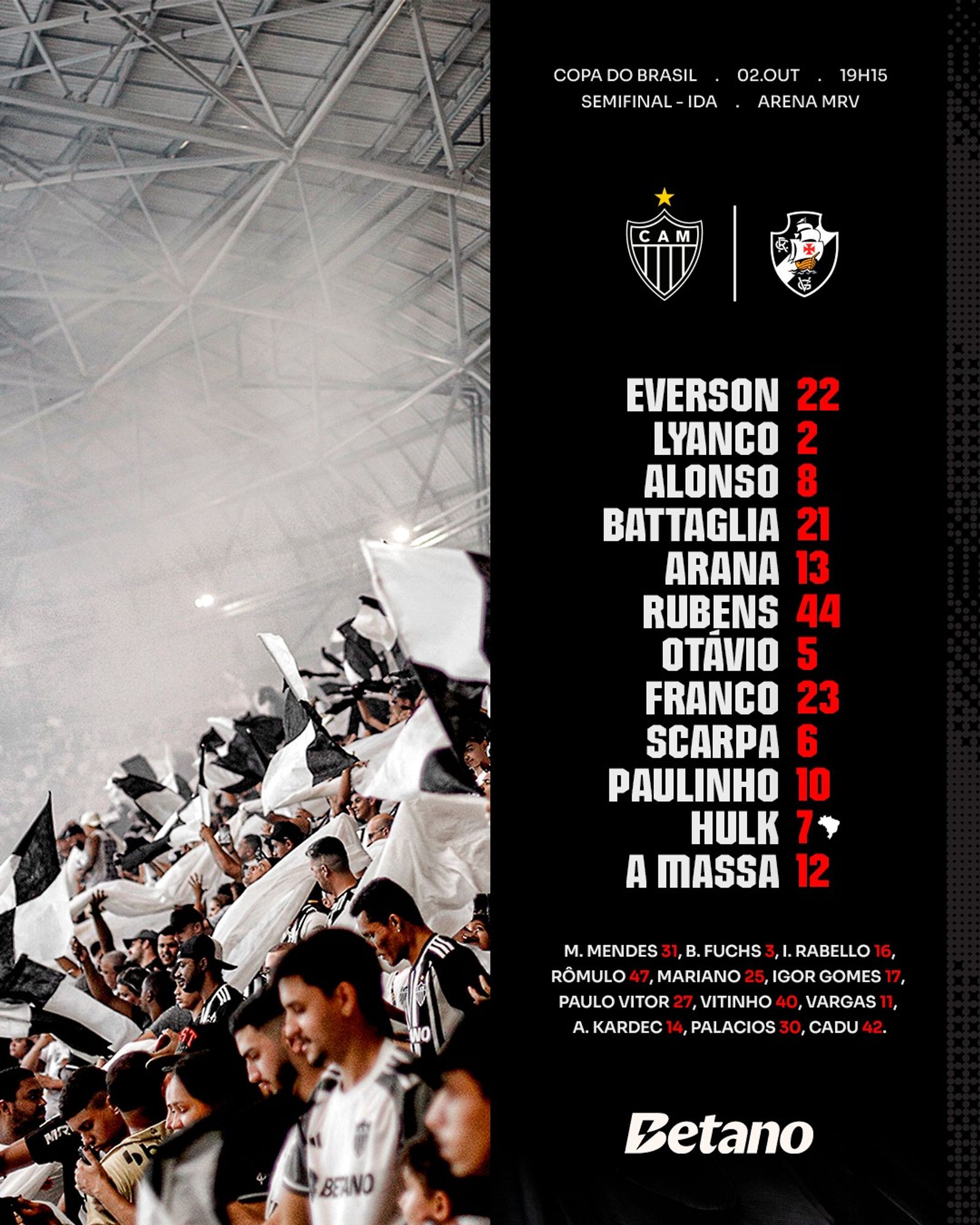 📋 GALO ESCALADO! Confira a nossa escalação para enfrentar o Vasco, na Arena MRV, pela partida de ida da semifinal da Copa Betano do Brasil!