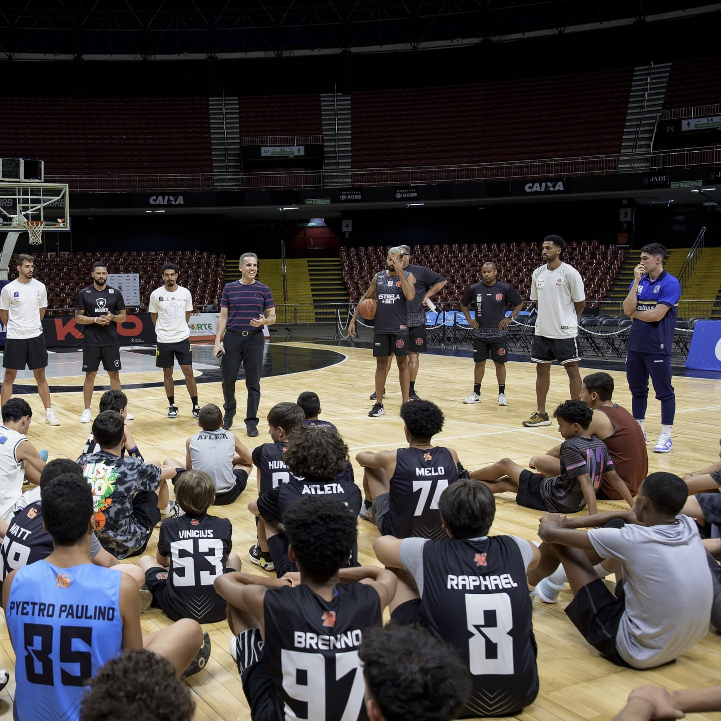 Entre um jogo e outro do Torneio de Abertura NBB Caixa, o técnico @leofigueiro, o assistente técnico @cassio_lsantos e @eugeniusz_6 ministraram, na quarta-feira (02) ao lado de outros técnicos e atletas do NBB Caixa, uma clínica para crianças e jovens, no Nilson Nelson.