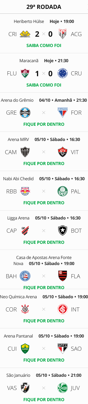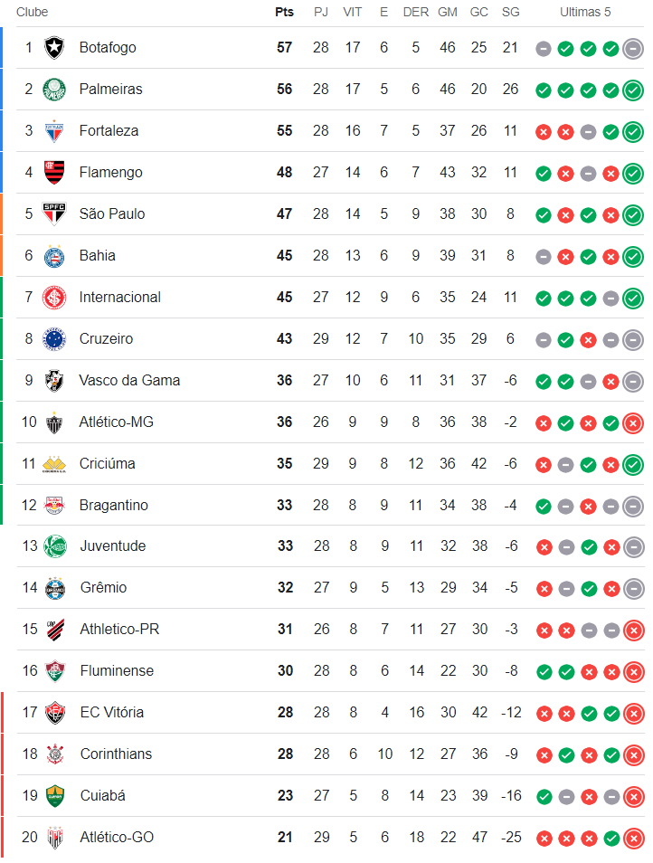 Dois jogos iniciaram a 29ª rodada do Campeonato Brasileiro nesta 5ª-feira. Veja os resultados e a classificação.