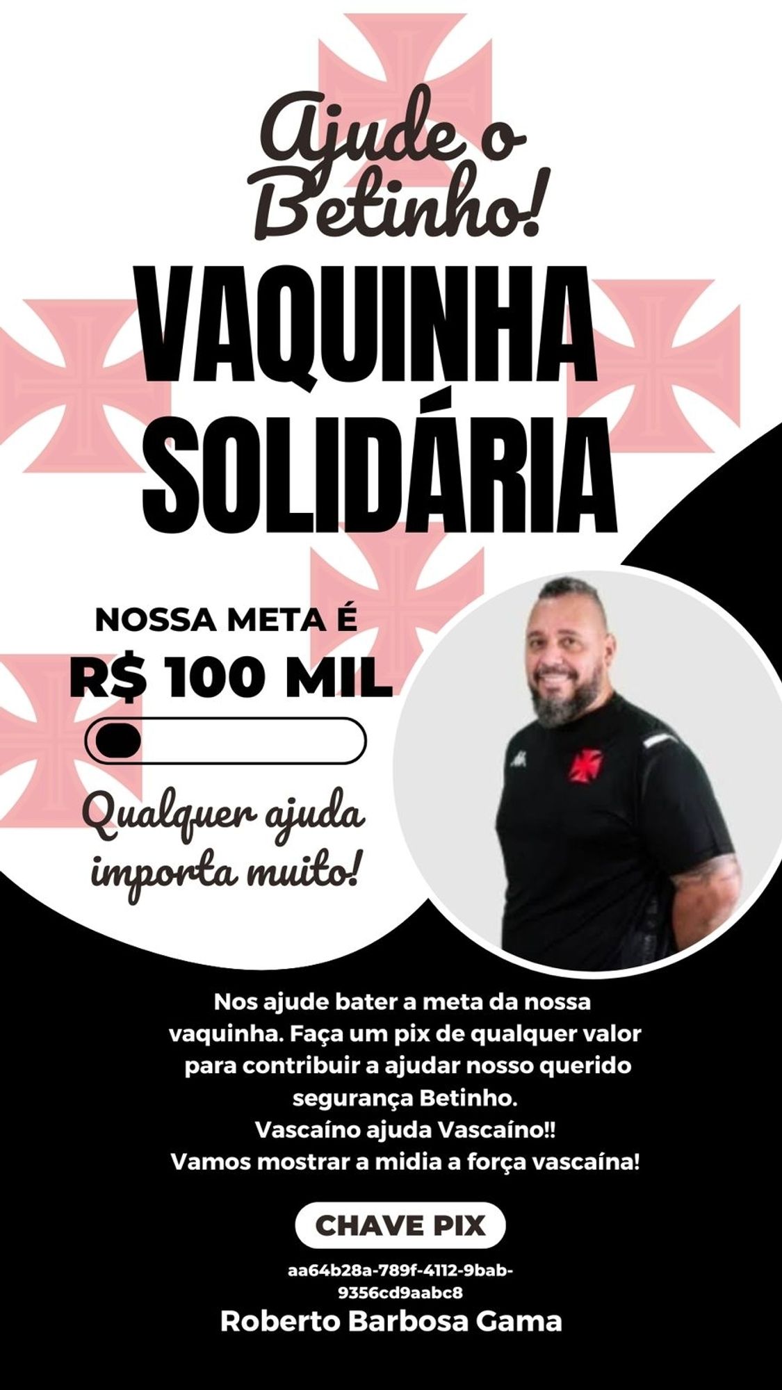 Torcedores do Vasco abriram uma campanha na Internet para ajudar o segurança Roberto Gama, o "Betinho", por conta da punição imposta a ele e ao clube hoje no STJD. Quem quiser ajudar, a chave Pix é: