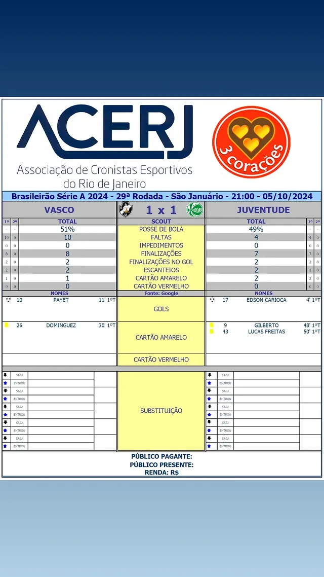 05/10/24 - Palpite NETVASCO: O resultado mais palpitado foi Vasco 2 x 0 Juventude