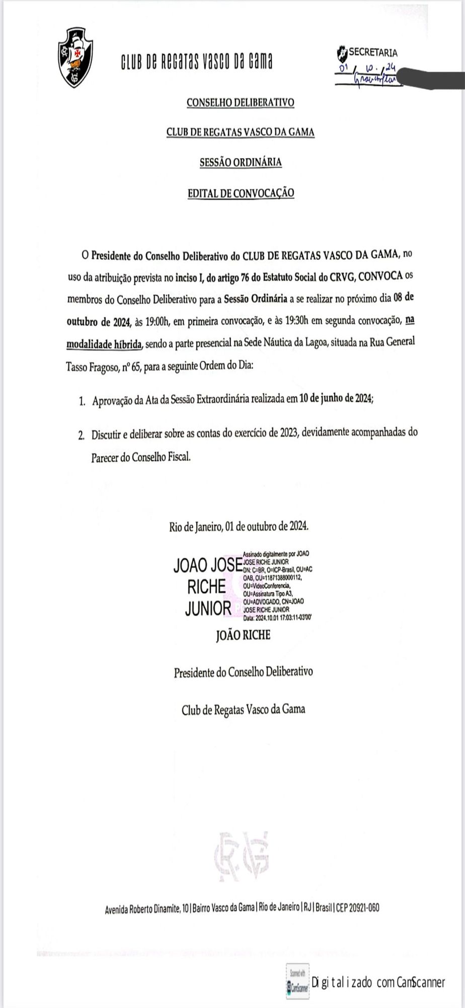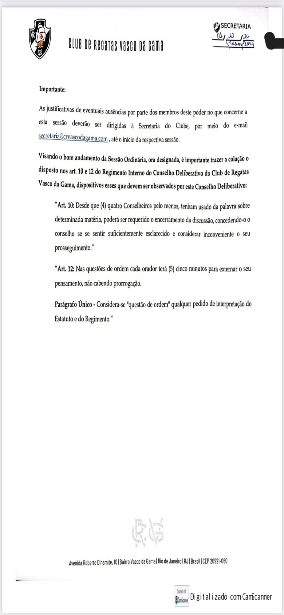 Eis a convocação para a reunião do Conselho Deliberativo do Vasco nesta terça-feira: