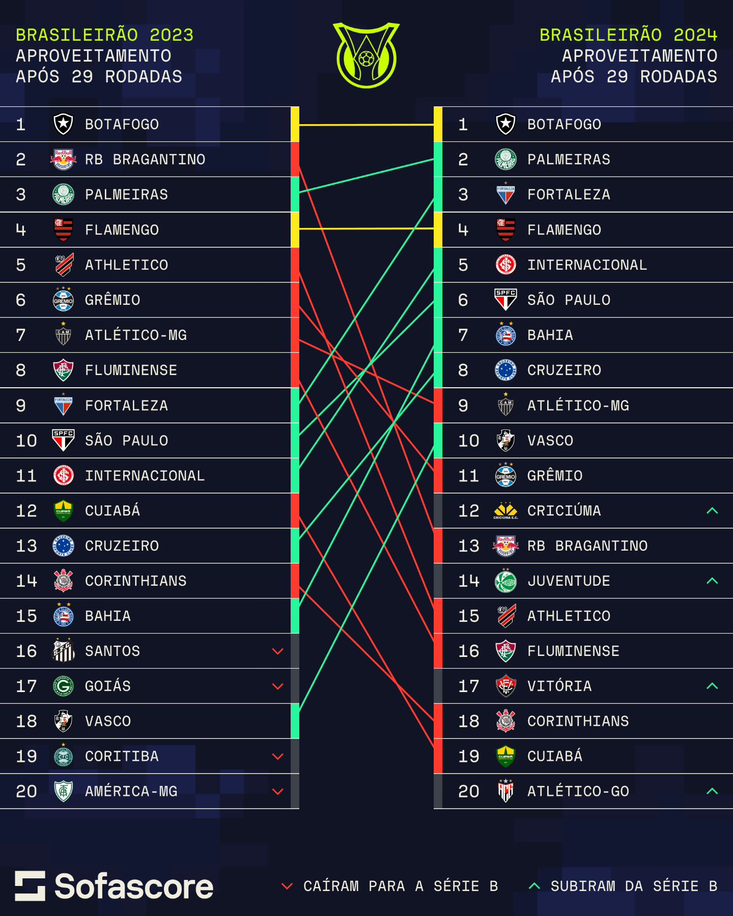 A classificação do Brasileirão 2023 e 2024 após 29 rodadas segundo o aproveitamento das equipes! 📊