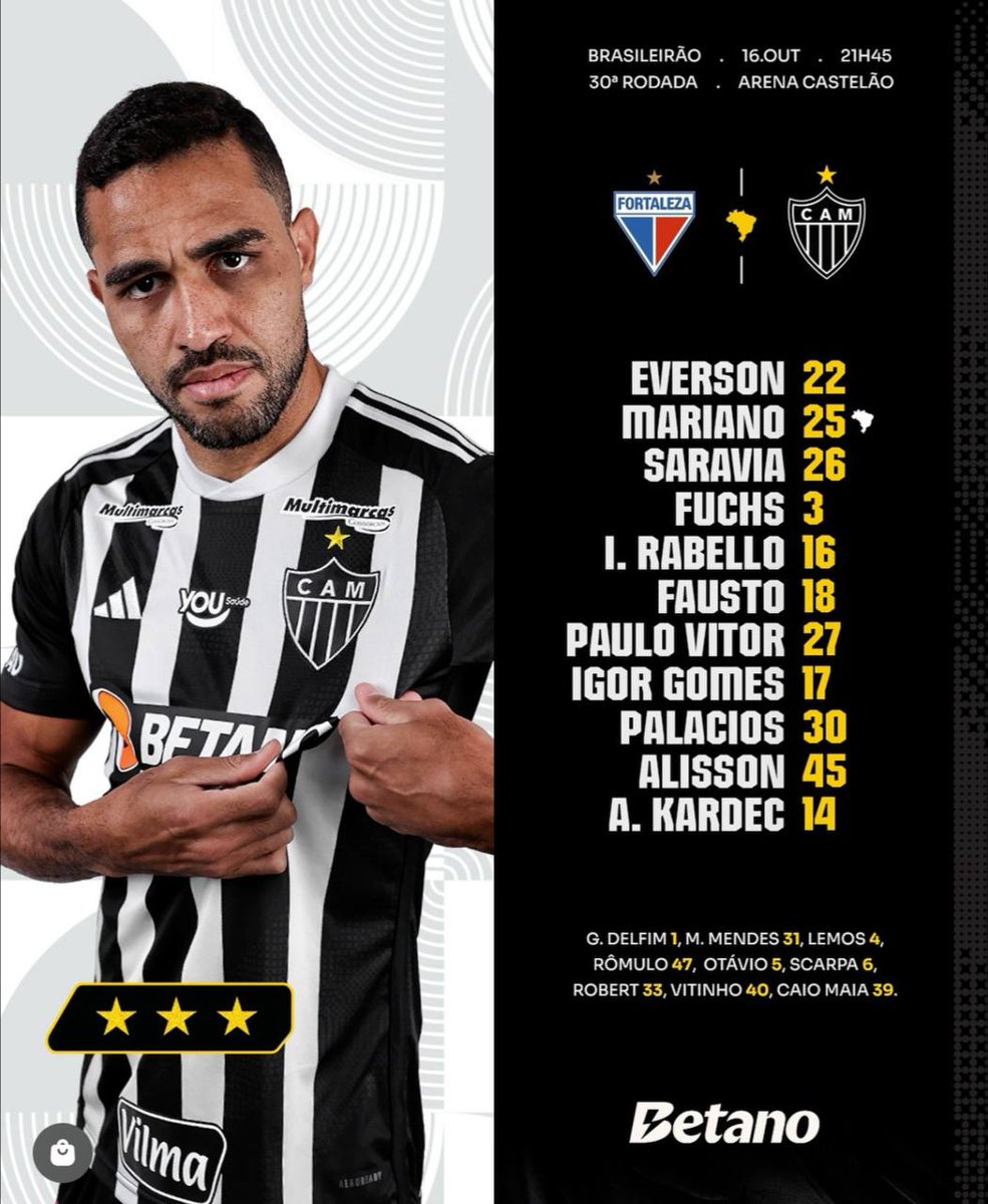 Atlético-MG escalado com o time praticamente todo reserva para enfrentar o Fortaleza.