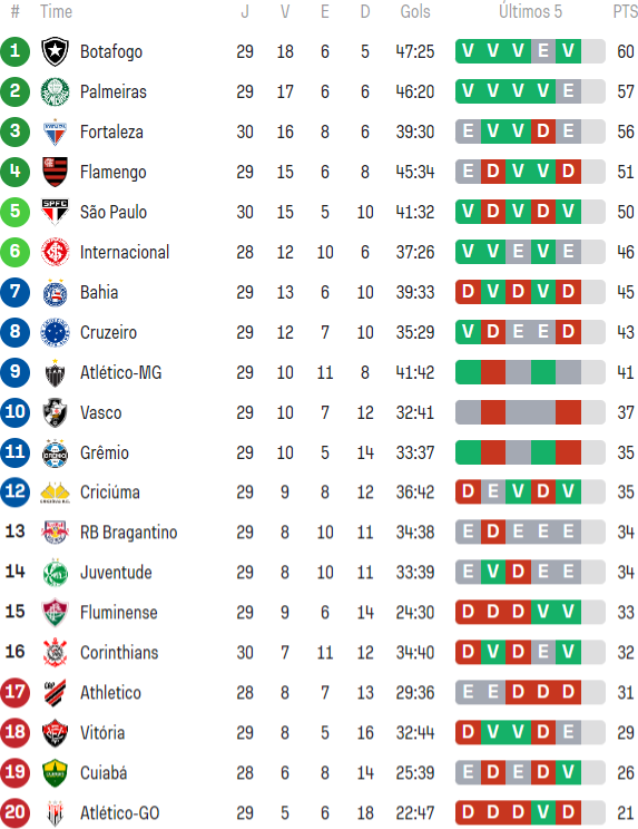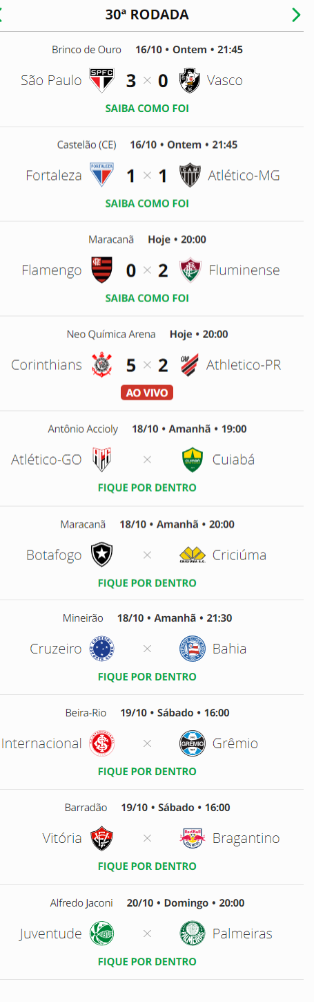 Terminados os jogos de quinta-feira da 30ª rodada do Campeonato Brasileiro, o Vasco, que perdeu para o São Paulo por 3 a 0 em Campinas, segue na 10ª colocação.