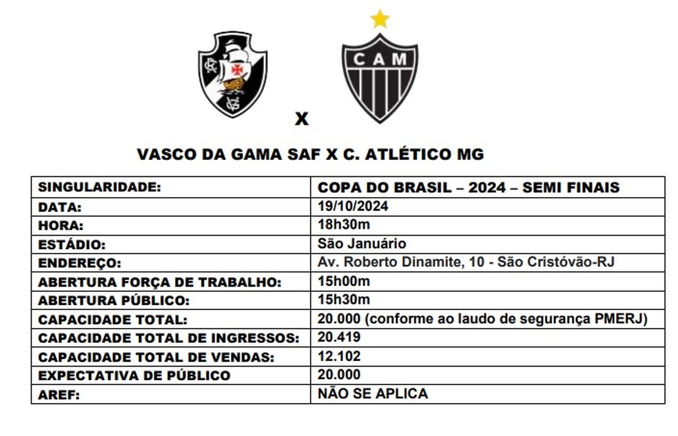 A ata de jogo da semifinal entre Vasco e Atlético-MG, deste sábado, às 18h30, em São Januário, revelou diminuição na quantidade de ingressos colocados à venda para a partida. Foram 12.102 ingressos colocados à venda e que se esgotaram rapidamente para o jogo pela Copa do Brasil.