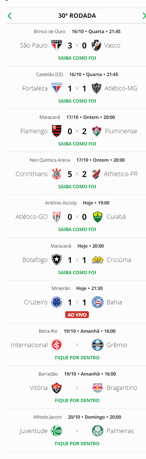Terminados os jogos de quinta-feira da 30ª rodada do Campeonato Brasileiro, o Vasco, que perdeu para o São Paulo por 3 a 0 em Campinas, segue na 10ª colocação.