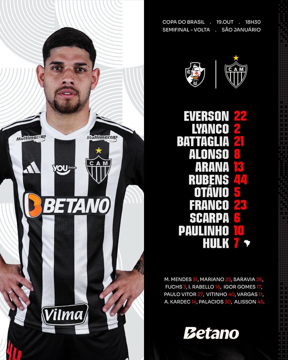 📋 GALO ESCALADO! Confira a nossa escalação para enfrentar o Vasco, em São Januário, pela partida de volta da semifinal da Copa Betano do Brasil!