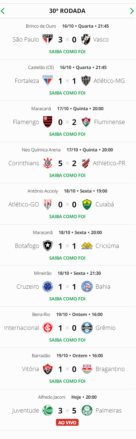 Terminada a 30ª rodada do Campeonato Brasileiro, o Vasco, que perdeu para o São Paulo na última quarte-feira, segue na 10ª colocação.