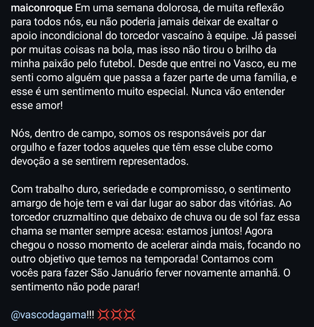 Maicon: 'Contamos com vocês para fazer São Januário ferver novamente amanhã'