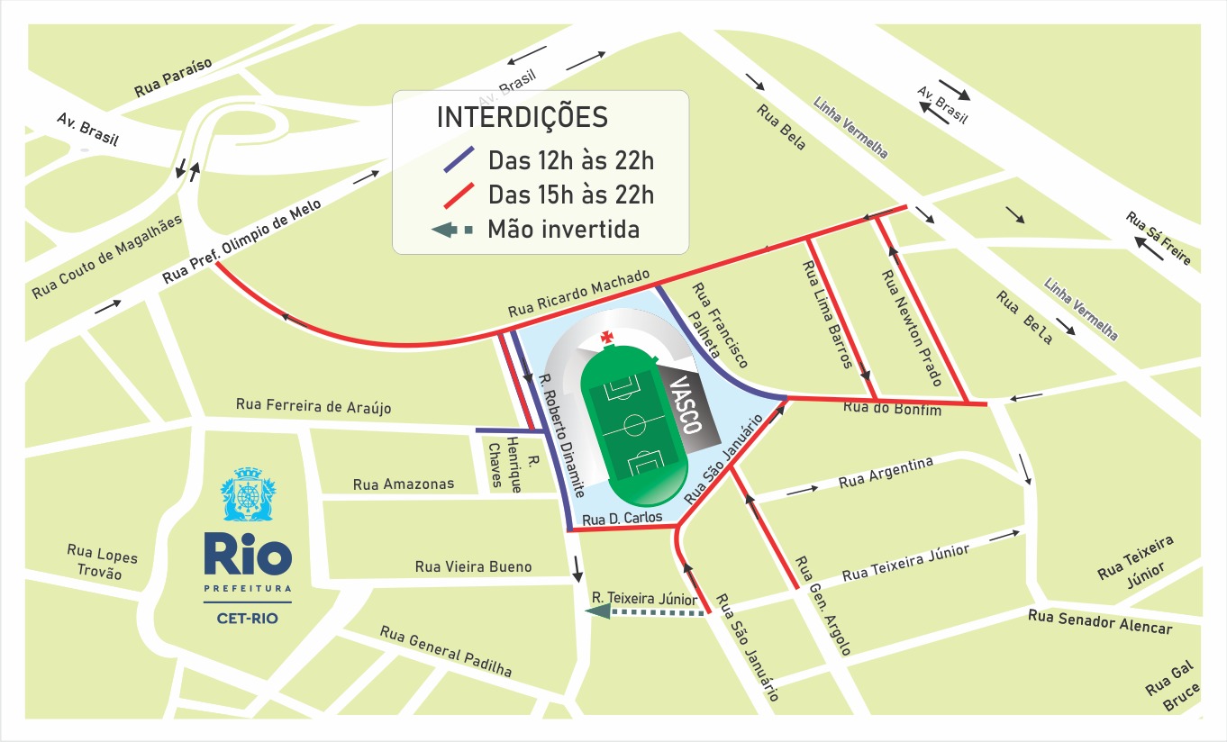 – Rua do Bonfim, no sentido ao estádio de São Januário, entre a rua Newton Prado e a rua São Januário;