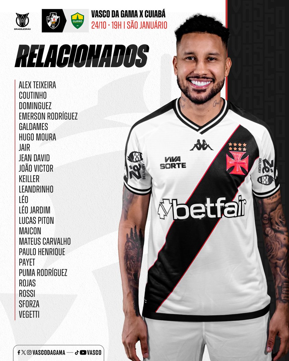 Vasco divulga os relacionados para o jogo contra o Cuiabá; Jair é a novidade