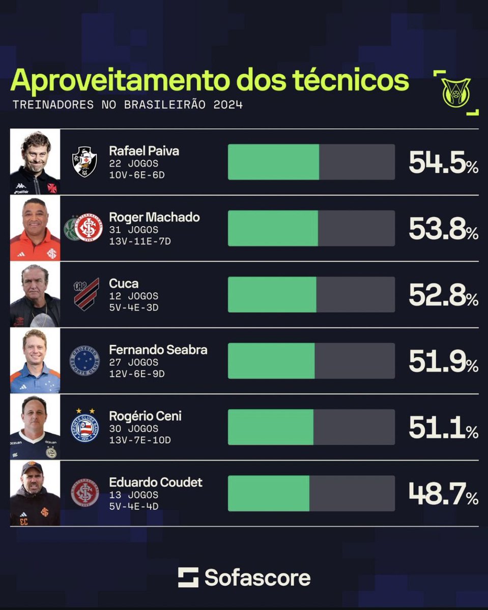 O @SofascoreBR levantou o aproveitamento dos treinadores que tenham completado ao menos 30% das partidas da atual edição da competição! 📊👨🏫