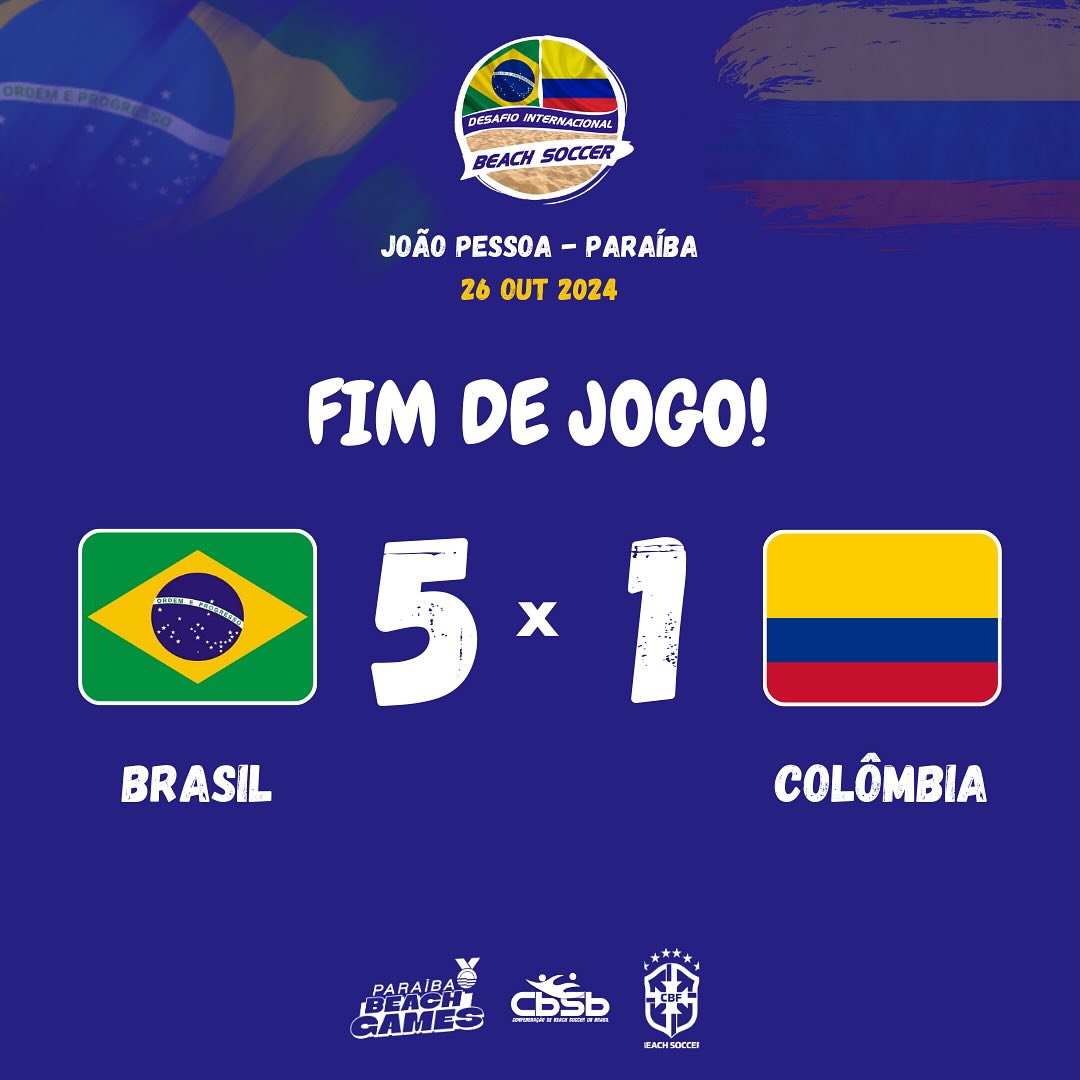 Em mais uma partida com arena lotada na praia de Tambaú, em João Pessoa, o Brasil voltou a derrotar a Colômbia, desta vez por 5 a 1, e ficou com o título do Desafio Internacional, evento que fez parte da programação do @paraibabeachgames ! 🏆🇧🇷⚽️🏖️